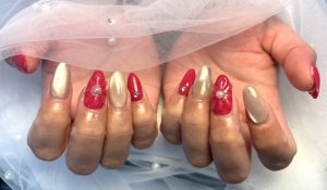 さらに、レッドカラーとゴールドを効かせたことで一気に大人の女性らしい指先に。